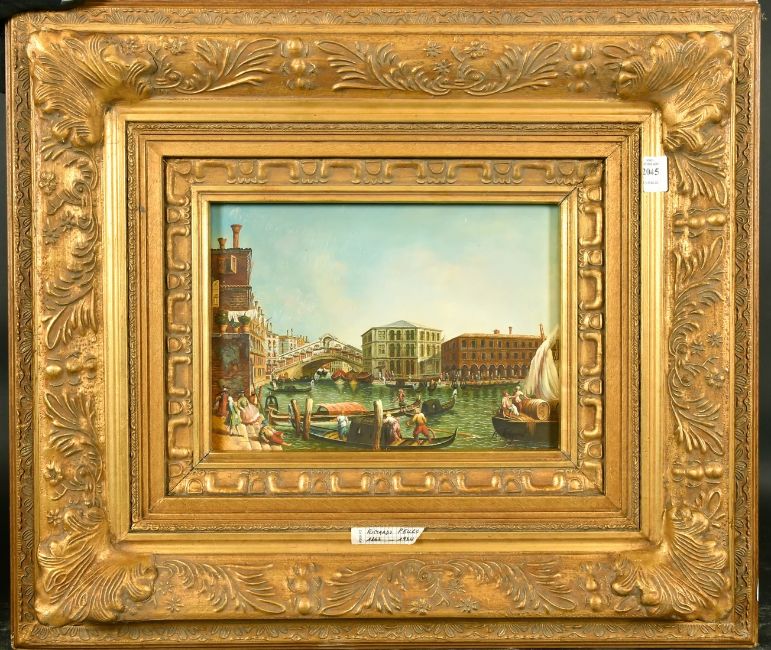 20th Century School, figures on gondolas with the Rialto Bridge in the distance, oil on panel, indistinctly signed, 9.5" x 12.5" (24 x 32cm).