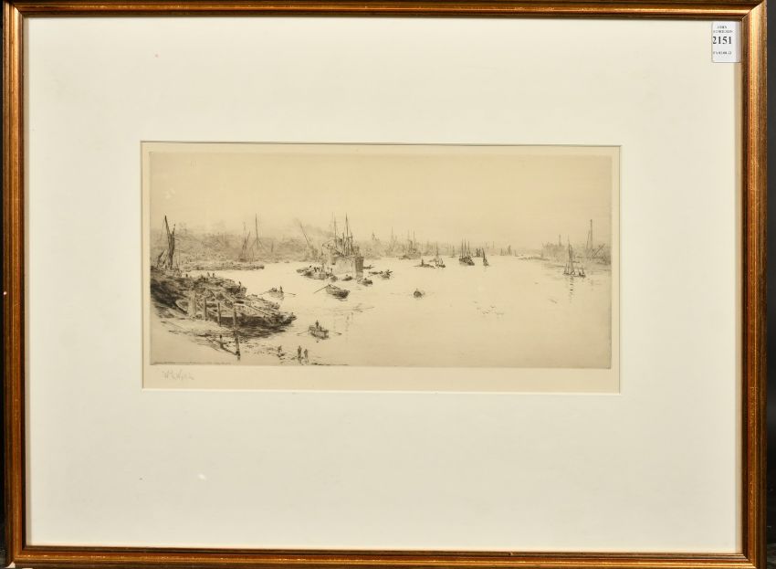 William Lionel Wyllie (1851-1931) A view of Deptford on the river Thames, etching, signed in pencil, 7" x 14.75".