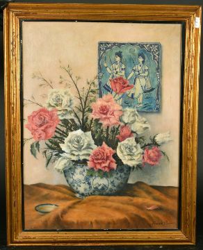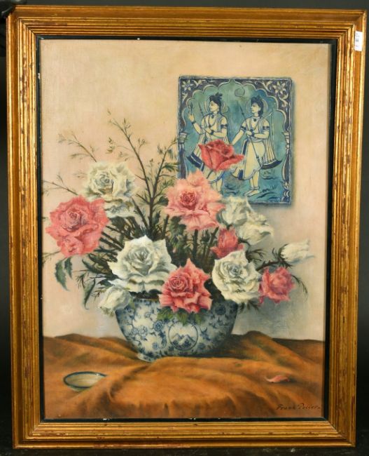 Frank Potter (b 1885) A still life of flowers and foliage in a blue and white bowl, oil on canvas, signed, 26" x 20", Bourlet label verso.