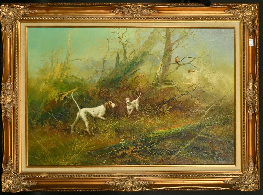 Kingsman (20/21st Century) Two Pointers in a wooded landscape searching for game, oil on canvas, signed, 24" x 36".