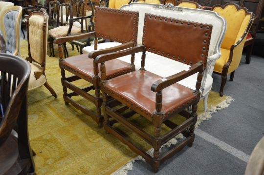 A pair of oak framed armchairs.