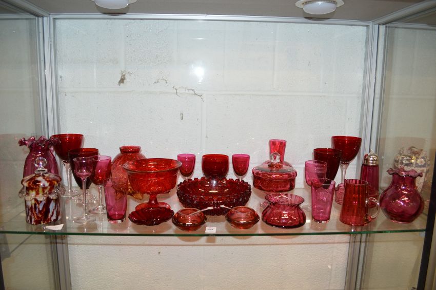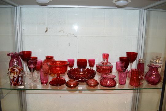 A good collection of cranberry and similar glassware.