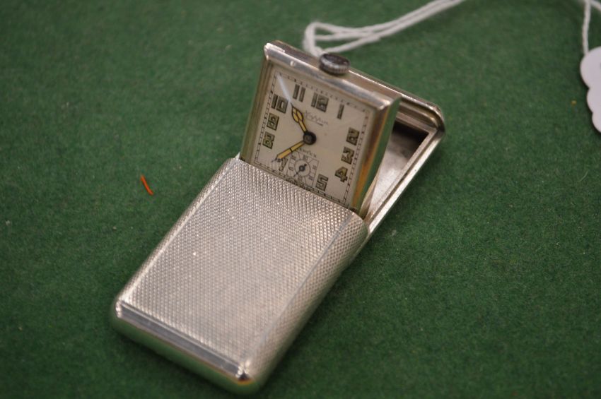 A small silver pop up travelling clock.