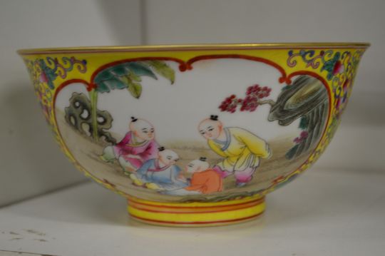 A Chinese famille jaune bowl painted with panels of children.