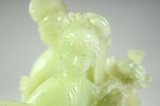 A CHINESE JADE FIGURAL GROUP ON A HARDWOOD STAND, the jade carved as two female figures, mounted to a carved and pierced hardwood base, overall 23cm high.