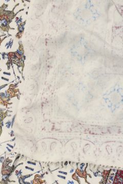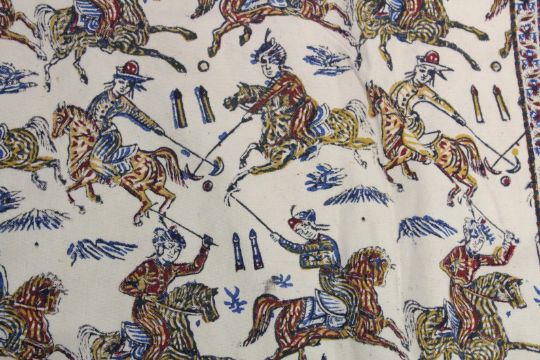 A LARGE PERSIAN STYLE MESHKAT HAND PAINTED TEXTILE, hand crafted with elaborate wooden stamp work, depicting a pattern of horse riders playing polo and blue foliate motifs with a paisley border, 275cm x 215cm.