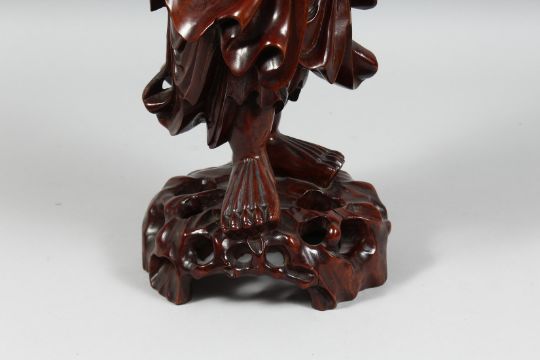 A LARGE CHINESE CARVED HARDWOOD FIGURE OF A SAGE holding a scroll, with inset teeth and eyes, the figure raised on a carved hardwood base. 50cm high