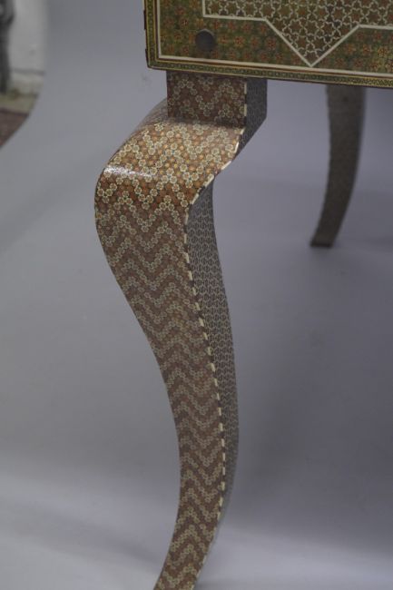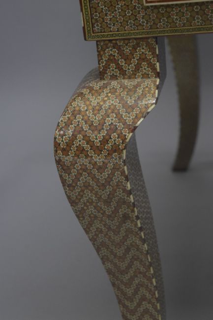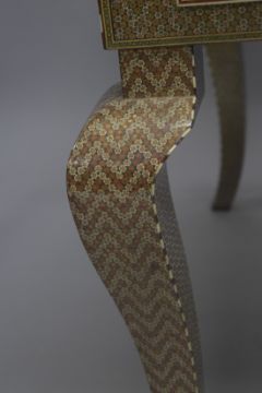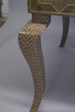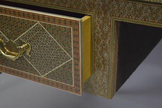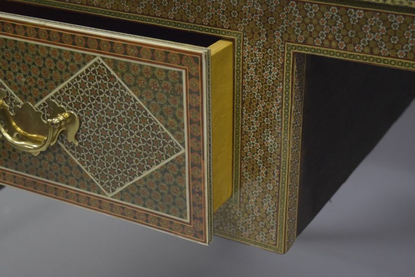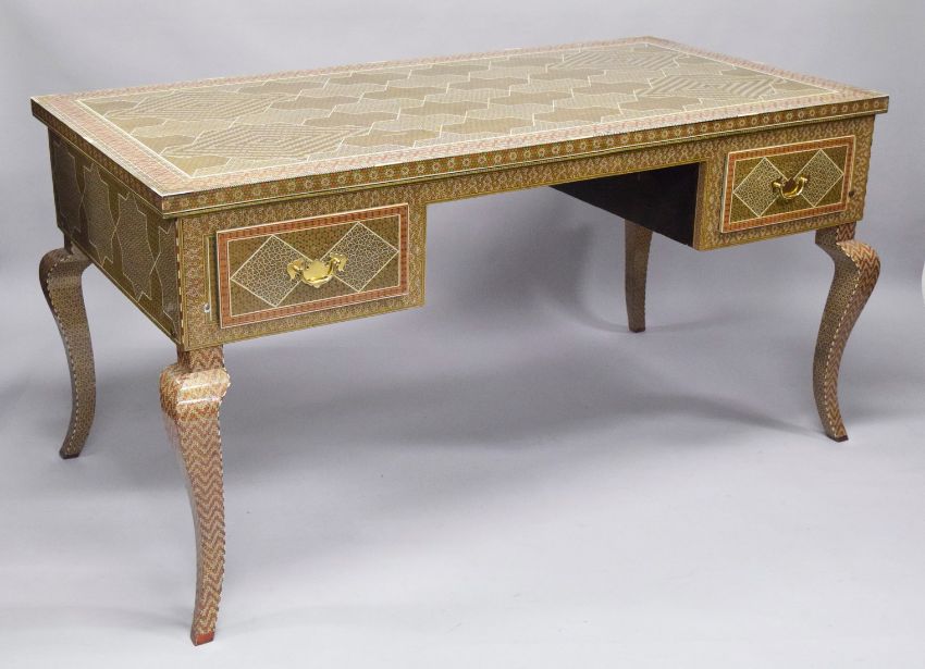 AN ISLAMIC MICRO MOSAIC, GILT AND BONE VENEERED DESK, the top with intricate geometric pattern and inlay, the front with two drawers, the desk supported on four curving legs, 164.5cm wide, 83.5cm high, 84.5cm deep