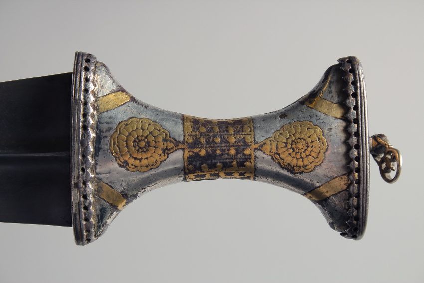 A VERY RARE AND FINE EARLY 19TH CENTURY NORTH INDIAN SILVER AND GOLD INLAID JAMBIYA DAGGER for the Arab market, with fine watered steel blade, 33cm long.