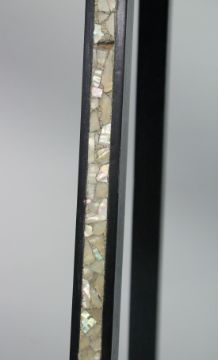 A MOORISH EBONISED TWO TIER JARDINIERE STAND, the top, undertier and legs all inlaid with panels of abalone, 114cm high, the top 30cm wide.