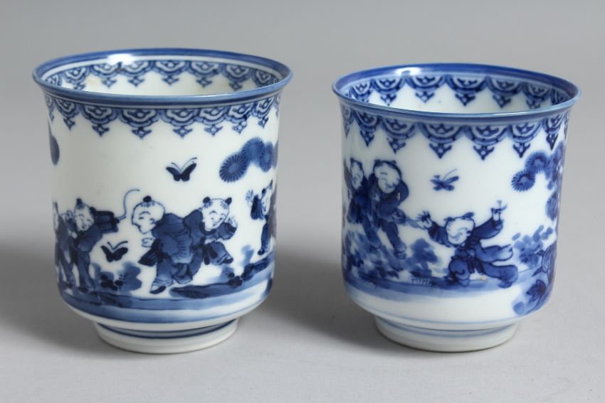 A NEAR-PAIR OF JAPANESE HIRADO BLUE AND WHITE PORCELAIN CUPS, each decorated with boys playing in a garden, one base with two-character mark, the other with a four-character mark. 7.5cm and 7cm high