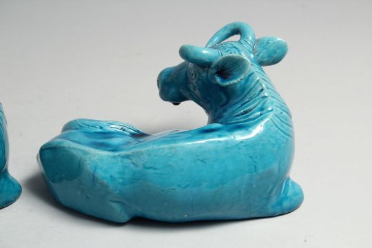 A PAIR OF CHINESE TURQUOISE GLAZED PORCELAIN FIGURES OF OXEN, 18.5cm long.