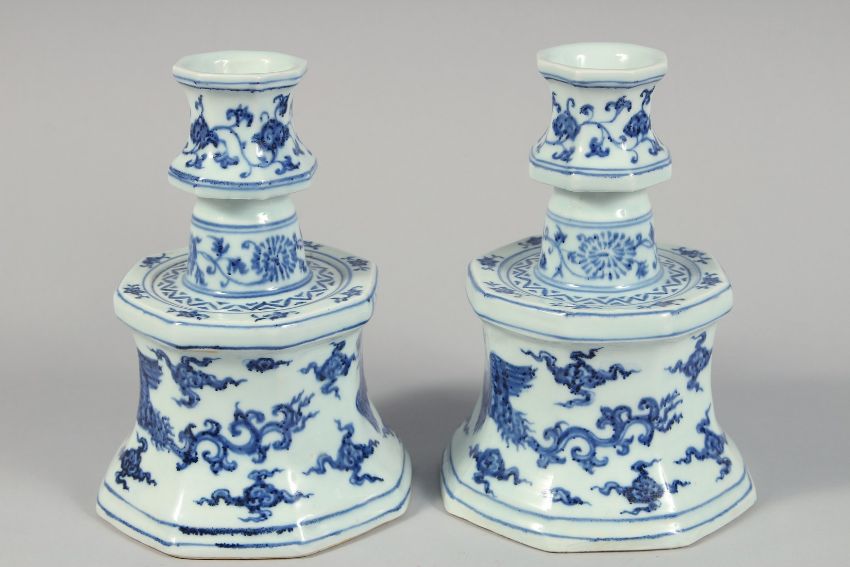 A PAIR OF CHINESE BLUE AND WHITE PORCELAIN CANDLESTICKS each decorated with phoenix and foliate motifs, each with six-character mark. 21cm high.