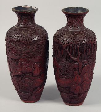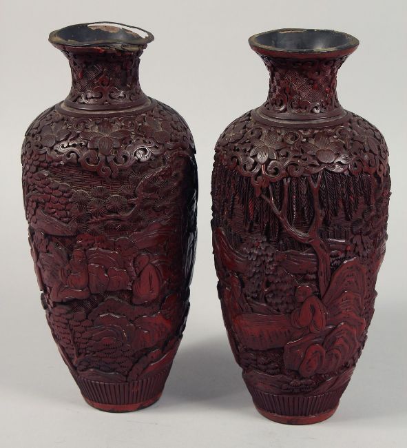 A PAIR OF 19TH CENTURY CHINESE CINNABAR LACQUER VASES, each decorated with figures in an outdoor setting, (with faults), 26cm high.