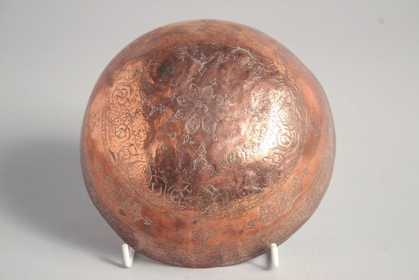 A FINE 18TH CENTURY PERSIAN SAFAVID COPPER BOWL, the exterior with engraved decoration and a band of calligraphy, 16cm diameter.