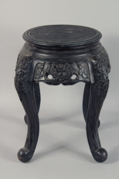 A SMALL CHINESE EBONISED HARDWOOD STAND, with carved frieze supported on four curving legs, top 29cm, 46cm high.