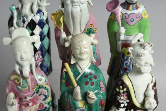 A COLLECTION OF NINE CHINESE FAMILLE ROSE PORCELAIN IMMORTAL FIGURES, the tallest 23.5cm high