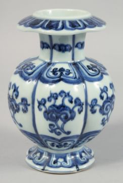 A CHINESE BLUE AND WHITE RIBBED PORCELAIN VASE, with decorative motifs to the body and six-character mark to base, 19cm high.