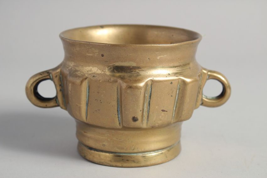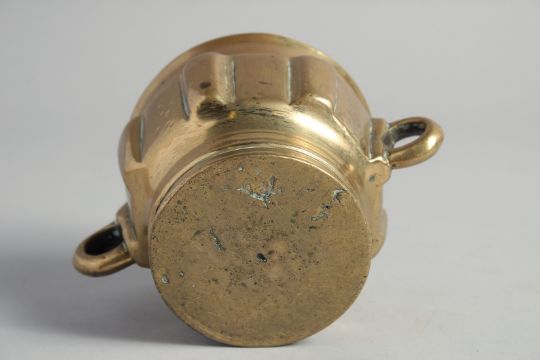 A 14TH/15TH CENTURY HISPANO MORESQUE BRASS MORTAR, with twin handles, 15cm wide (handle to handle).