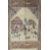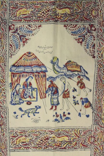 A LARGE PERSIAN STYLE MESHKAT HAND PAINTED TEXTILE, hand crafted with elaborate wooden stamp work, depicting a pattern panels of various scenes including seated figures, figures on horseback and multiple animals, 271cm x 212cm.