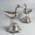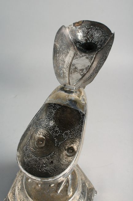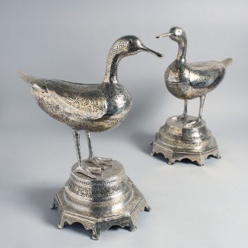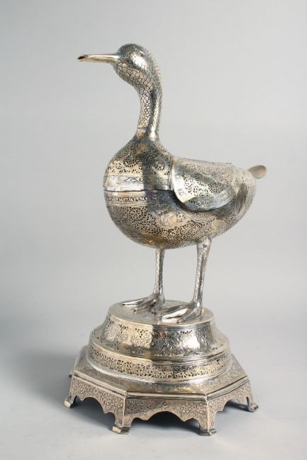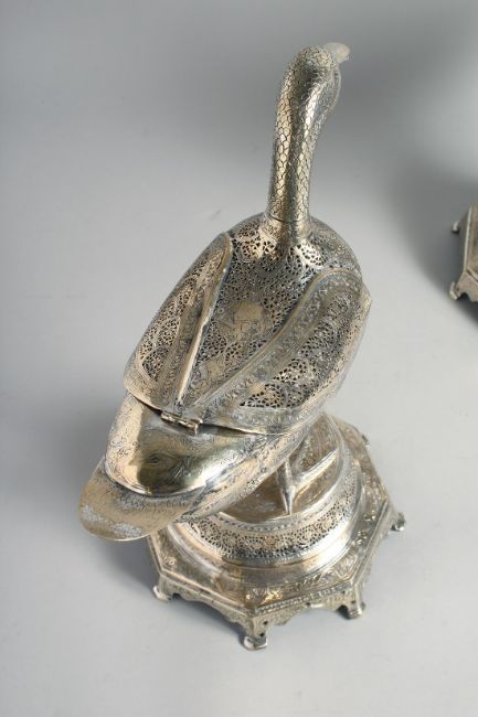 TWO FINE LARGE 19TH CENTURY PERSIAN QAJAR WHITE METAL OPEN WORK DUCK FORMED INCENSE BURNERS, the top section of the ducks as hinged lids with finely engraved and pierced decoration, each mounted to an octagonal open worked base raised on eight feet, 39cm high.