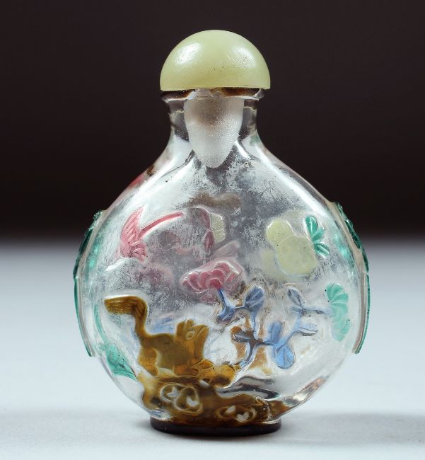 A SUPERB CHINESE ROCK CRYSTAL SNUFF BOTTLE AND JADE STOPPER, with carved and stained decoration depicting flora and fauna, with fitted box, 6cm high