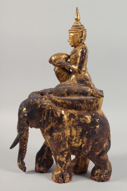 A RARE LARGE THAI GILT WOOD FIGURE OF A DEITY RIDING AN ELEPHANT, 47cm high