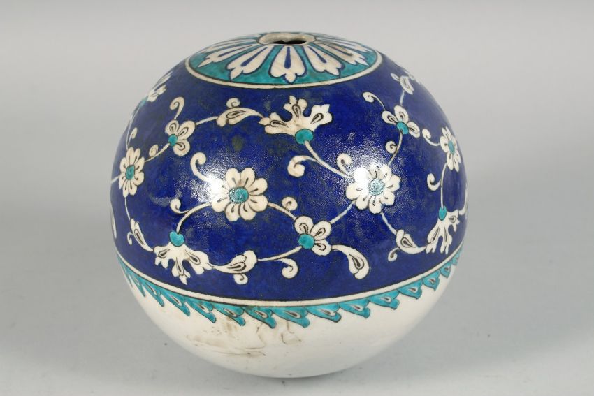 A RARE LARGE IZNIK GLAZED POTTERY HANGING BALL ORNAMENT, with a band of scrolling foliate decoration, approx 18cm diameter.