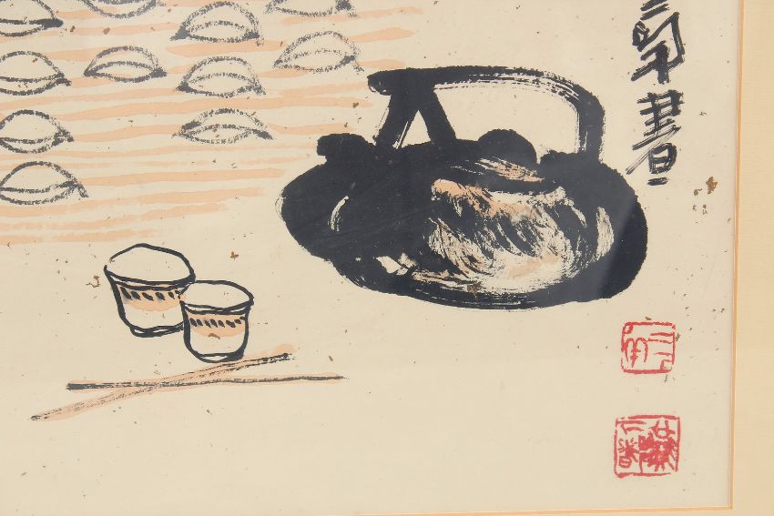 TWO CHINESE PAINTINGS ON PAPER BY SAN YANG, one in caricatured style depicting a reclining elderly figure; a cat at his side with a female figure serving tea, inscribed and with two red marks, image 31cm square, the other painting of a kettle with two teacups beneath leaves, inscribed and with four red seals, 30.5cm square, each picture framed and glazed, (2).