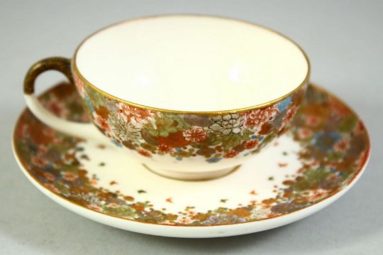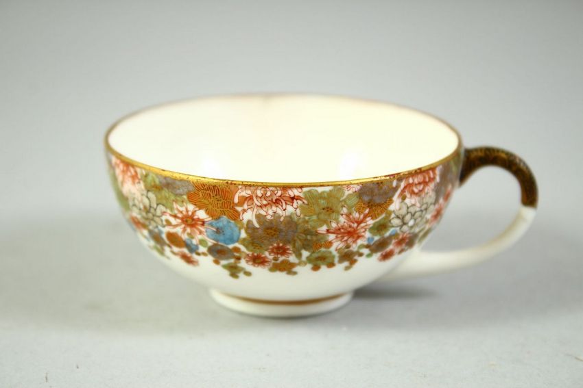 A SMALL JAPANESE SATSUMA CUP AND SAUCER, finely decorated with flowers and butterflies, each piece with gilt mark to base, cup 6.5cm diameter (excl. handle), saucer 10cm diameter.