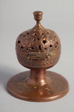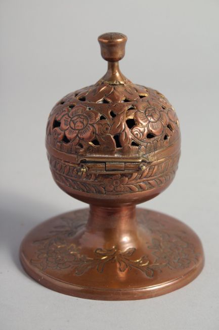 AN 18TH CENTURY TURKISH OTTOMAN GILT COPPER TOMBAK INCENSE BURNER, 12cm high.