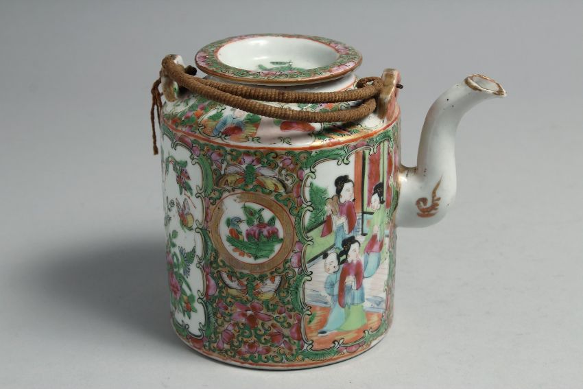 A CHINESE CANTON FAMILLE ROSE PORCELAIN TEAPOT, 13cm high.