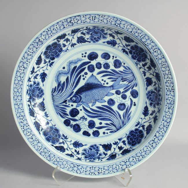 A LARGE CHINESE BLUE AND WHITE PORCELAIN CHARGER, painted with a central fish and aquatic flora, 46cm diameter.