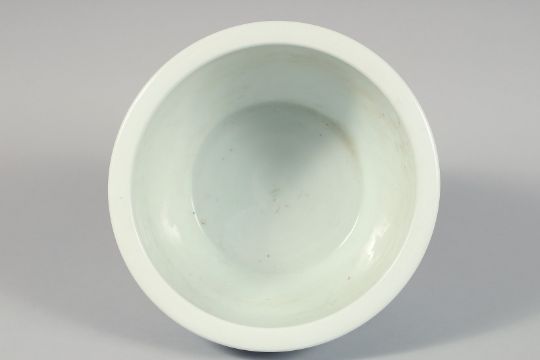 A CHINESE BLUE AND WHITE PORCELAIN BOWL decorated with fish and aquatic flora, the rim bearing six-character mark. 26cm diameter