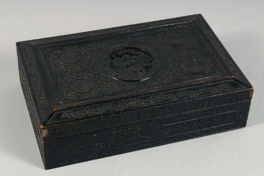 A CHINESE CARVED AND EBONISED WOODEN BOX, the hinged lid carved with central roundel containing figures and further decorated with flower heads and scrolling vines, 32.5cm x 20.5cm x 9cm