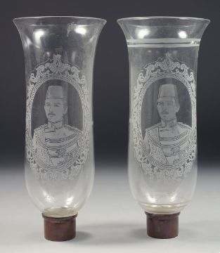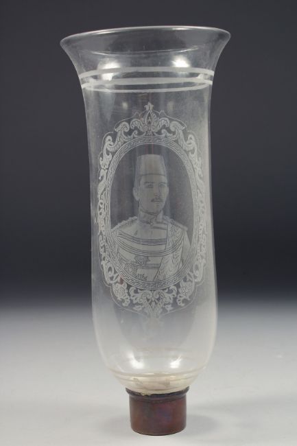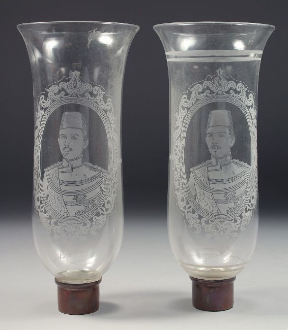 TWO OTTOMAN EGYPTIAN GLASS LAMP SHADES, both depicting a portrait of Abbas Hilmi Pasha, 27.5cm high, (2).