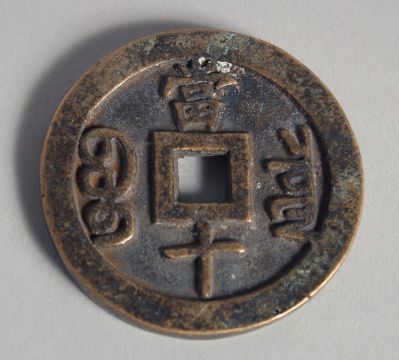 A LARGE CHINESE BRONZE COIN, with four characters, 6.5cm diameter.