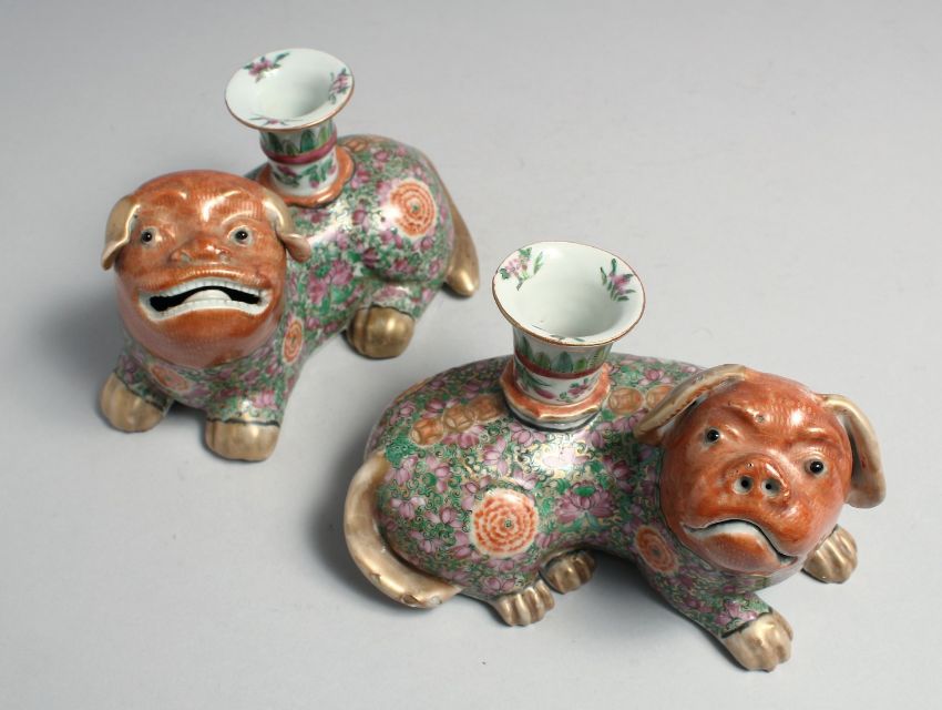 A PAIR OF 19TH CENTURY CHINESE CANTON FAMILLE ROSE PORCELAIN FOO DOG CANDLESTICK HOLDERS, the body of each with floral decoration, the heads with coral red ground and gilt highlights, each approx. 17cm long