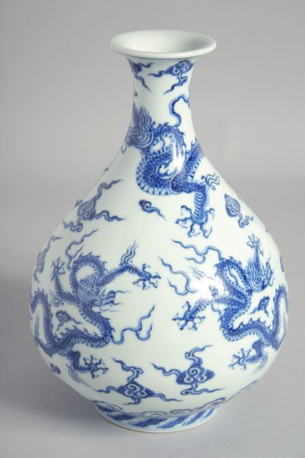 A CHINESE BLUE AND WHITE PORCELAIN VASE, decorated with dragons amongst stylised clouds, bearing a six-charatcer mark, 26cm high.