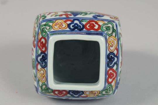 A CHINESE WUCAI PORCELAIN SQUARE FORM JAR, painted with dragons and with six-character mark to base, 10.5cm high.
