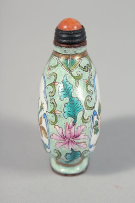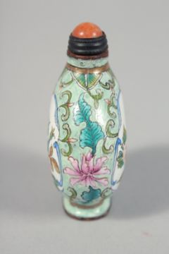A SMALL CHINESE ENAMELLED COPPER SNUFF BOTTLE AND STOPPER decorated with a panel to each side with native flora, the base with four-character mark. 5cm high