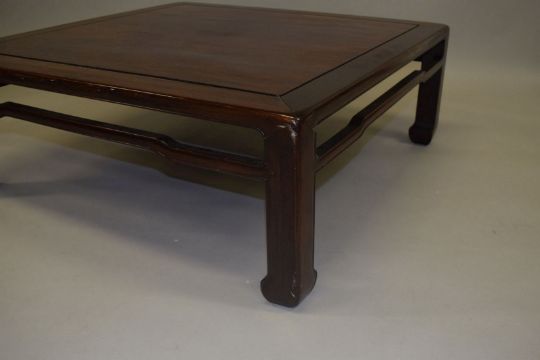 A GOOD CHINESE HARDWOOD SQUARE TABLE, on square form legs, 33cm high, 90cm square.