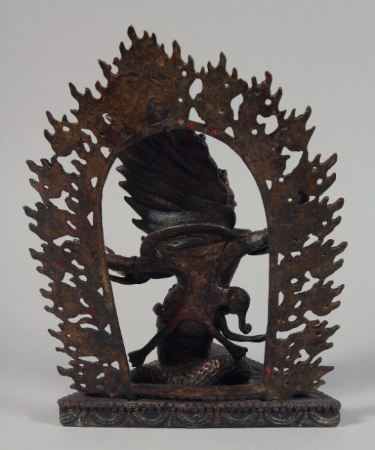 A TIBETAN BUDDHIST BRONZE OF RAHULA with snake's body, surrounded by a halo of fire. The figure showing traces of gilt, and possibly lacking a bow and arrow. Overall height 31.5cm