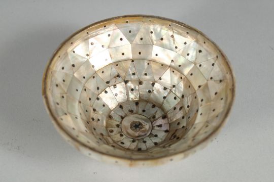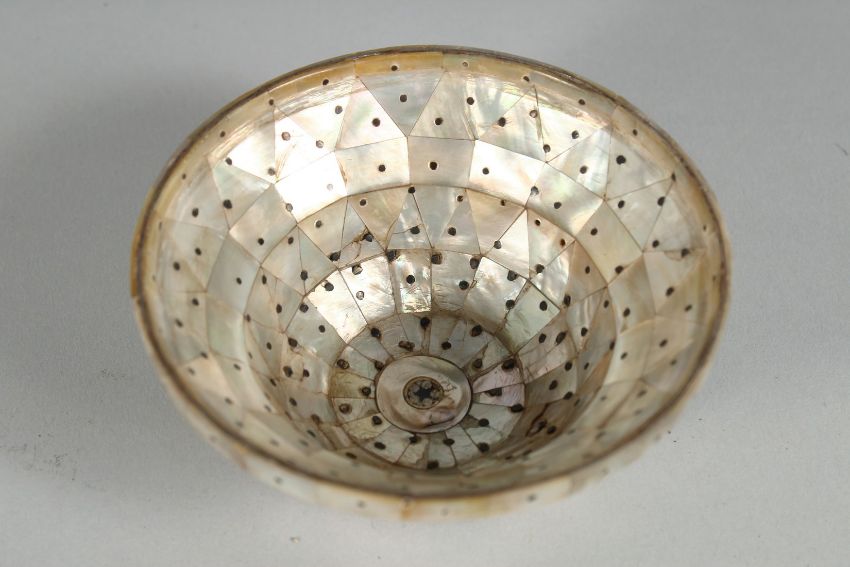 A TURKISH OTTOMAN MOTHER OF PEARL CIRCULAR BOX AND COVER, 9cm diameter.