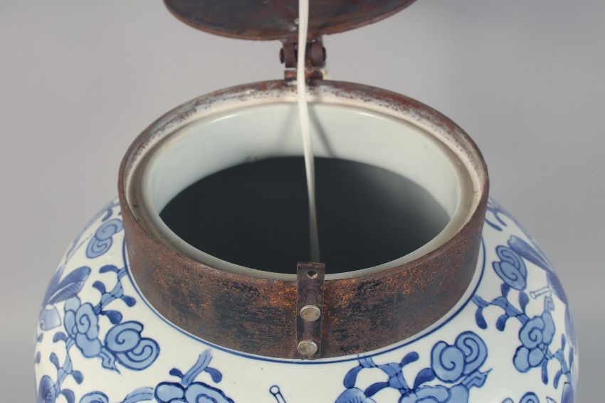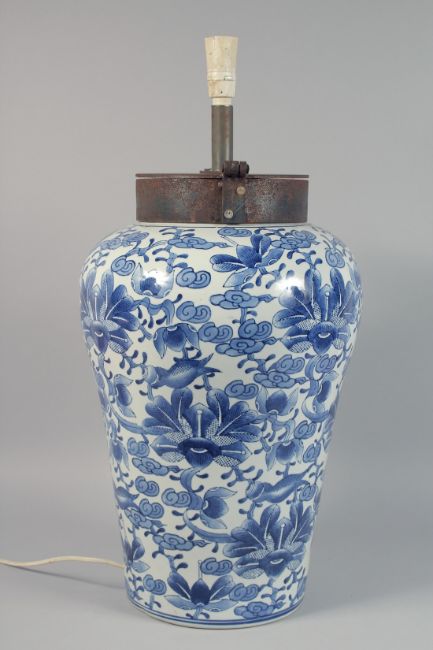 A LARGE CHINESE BLUE AND WHITE PORCELAIN LAMP VASE decorated with foliate design, drilled for electricity but untested. 68cm high.