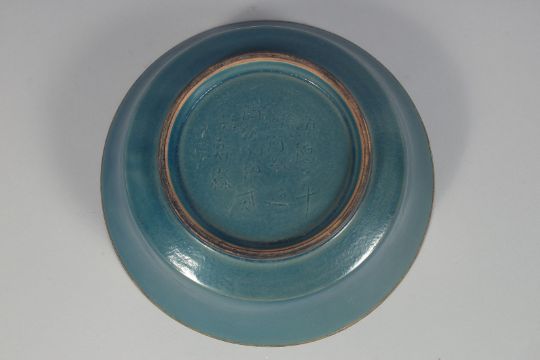 A LARGE CHINESE TURQUOISE GLAZED PORCELAIN BOWL, the interior centre with incised gilt characters. 22.5cm diameter