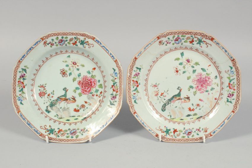 A PAIR OF CHINESE FAMILLE ROSE OCTAGONAL PORCELAIN PLATES, (with faults) 22cm wide, together with A CHINESE CANTON PORCELAIN SAUCER, 14.5cm (3)