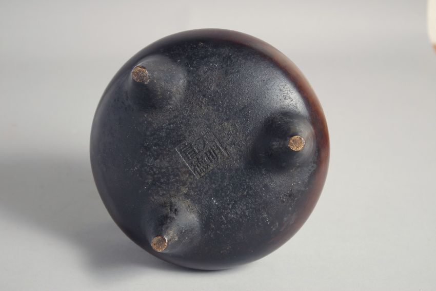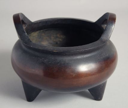 A SUPERB EARLY CHINESE BRONZE TRIPOD CENSER, possibly 17th/18th century, with twin handles, the base with four character mark, 17cm diameter.