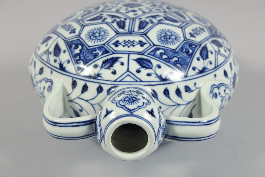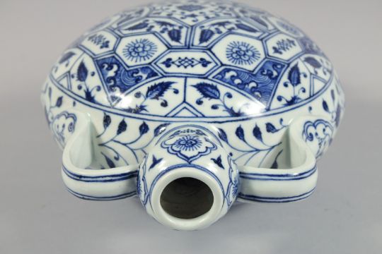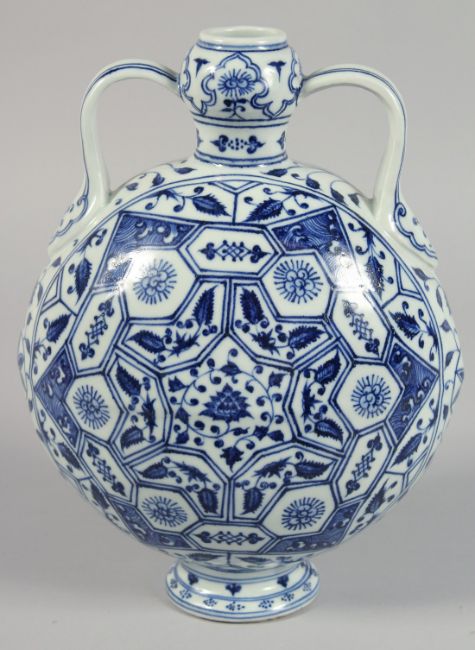 A CHINESE BLUE AND WHITE PORCELAIN TWIN-HANDLED MOON FLASK decorated with multiple panels of flora, the base with four-character mark. 28cm high