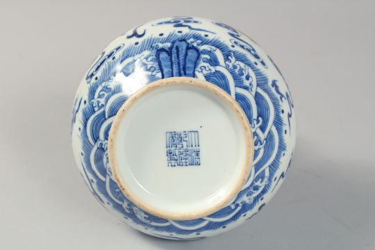 A CHINESE BLUE AND WHITE PORCELAIN DOUBLE GOURD VASE, decorated with coral red and gilt dragons beneath a band of stylised waves, the base with six-character mark, 26.5cm high.